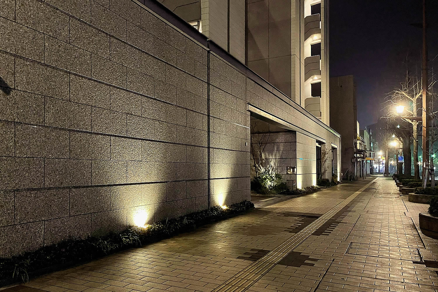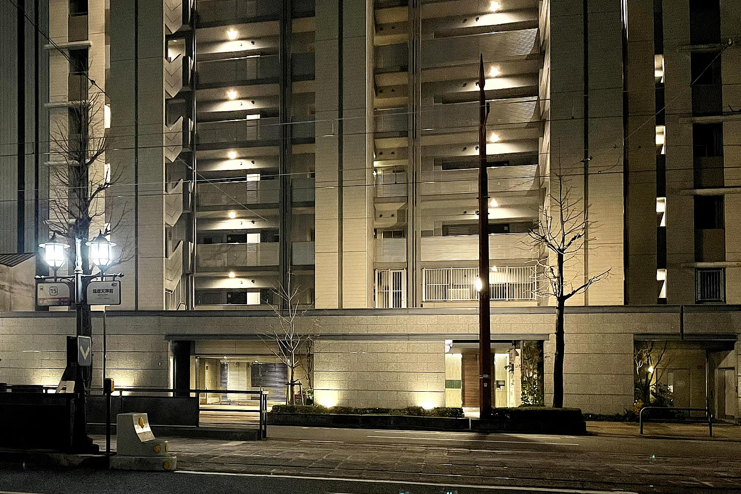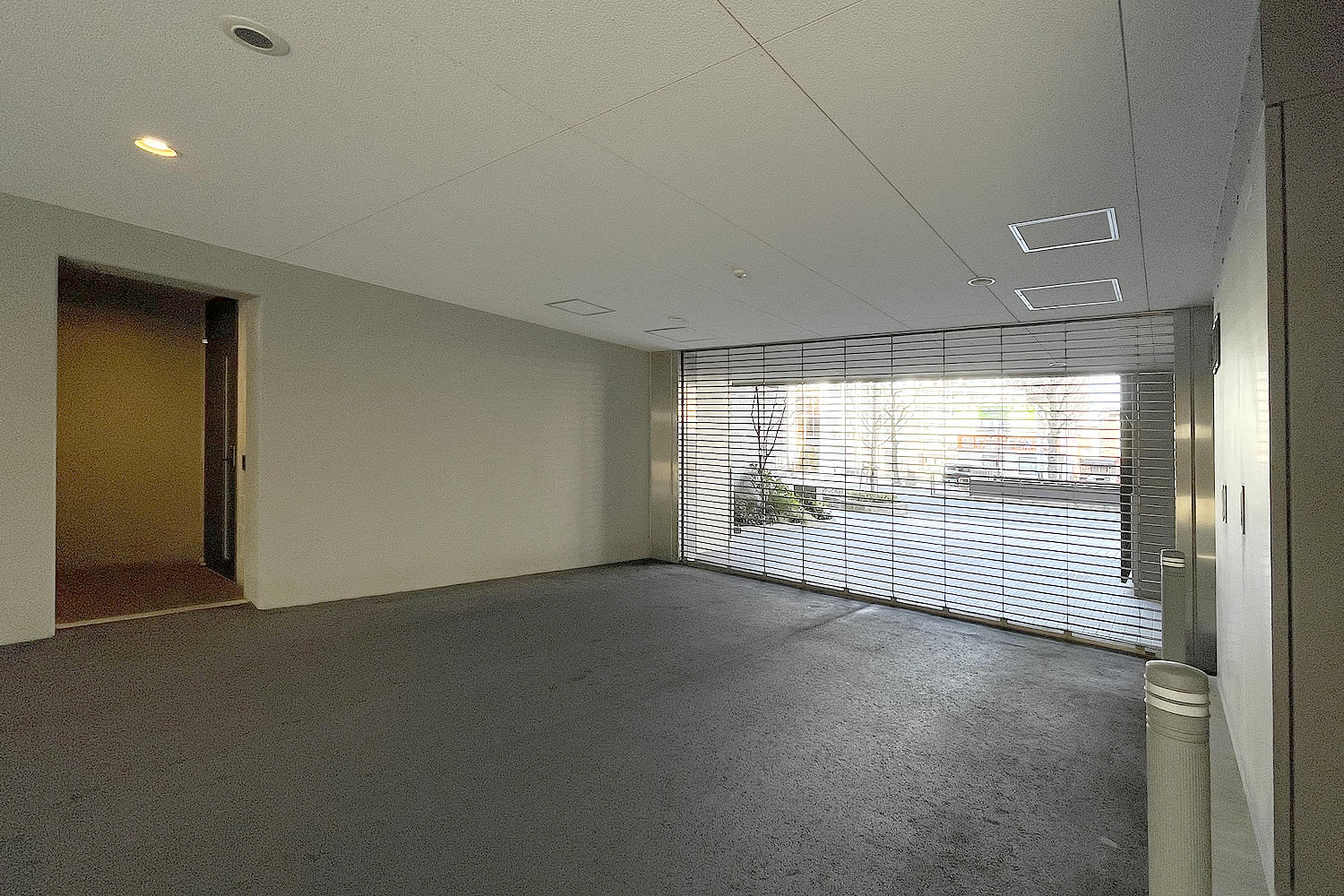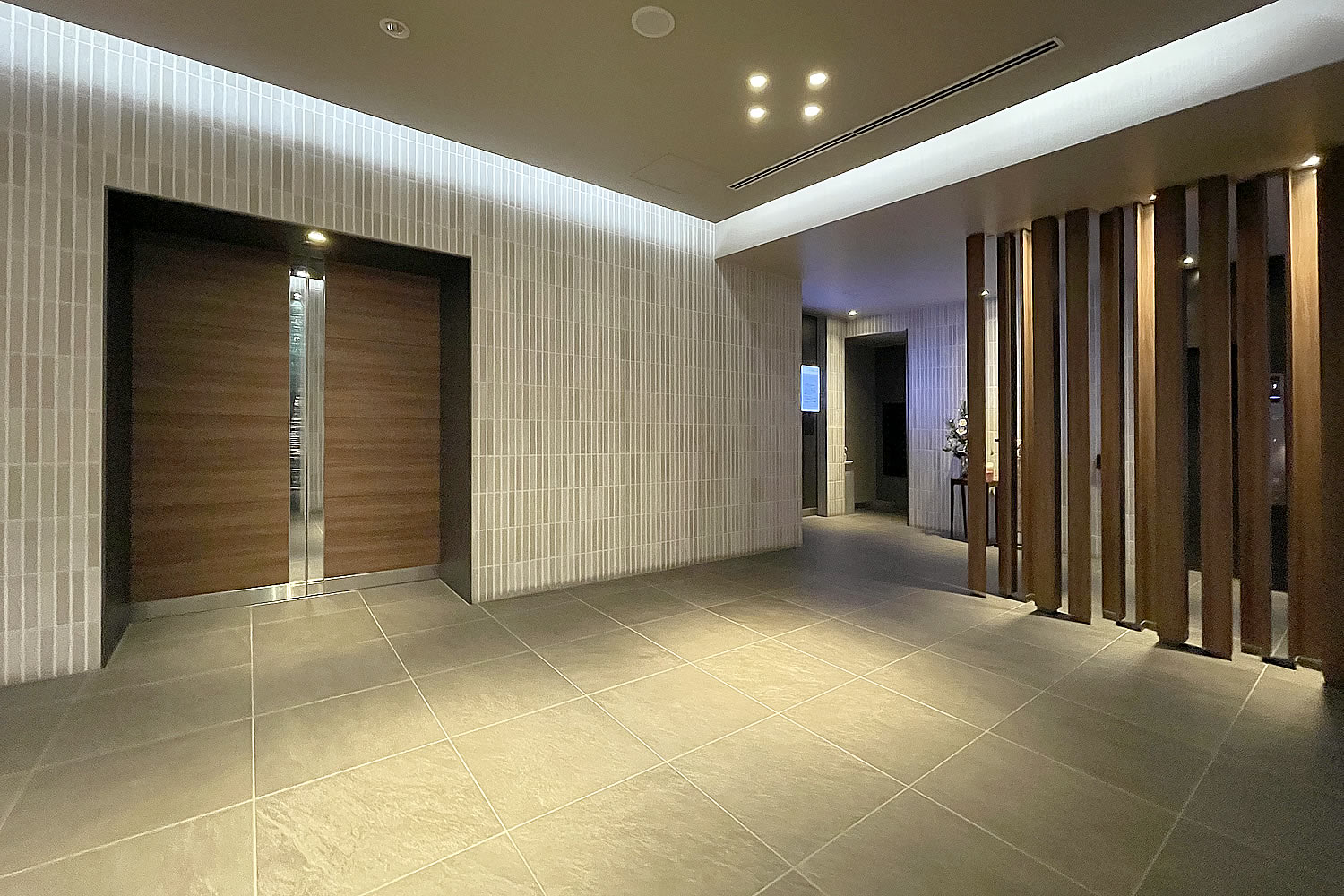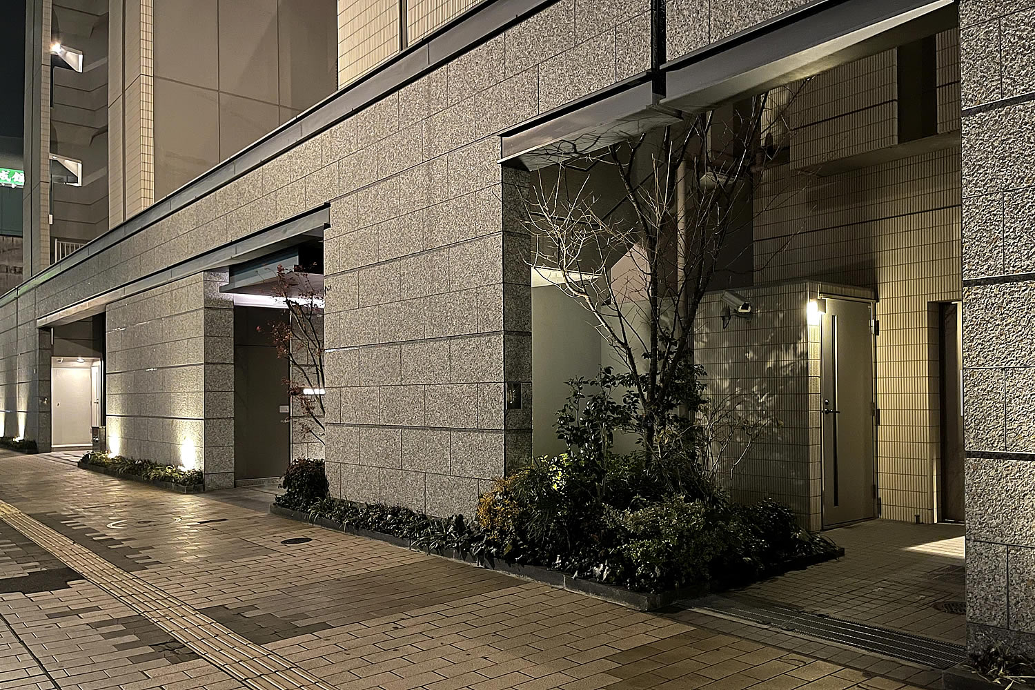 目の前に街路樹があるのでこの空間には枯葉が吹き込みやすいのですが、いつも清掃が行き届いていて気持ちが良いです。そして、この先のセキュリティもばっちりです。
